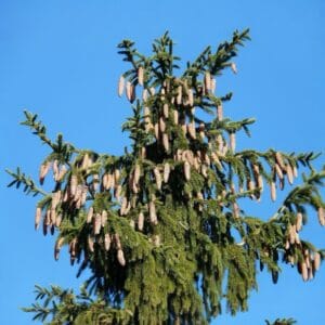 A termések kicsi, gömbölyű tobozok, amelyek 1-2 cm hosszúak. Érése ősszel történik, és színe zöldről barnára változik. A tobozok vonzzák a madarakat, amelyek szívesen fogyasztják a magokat.
